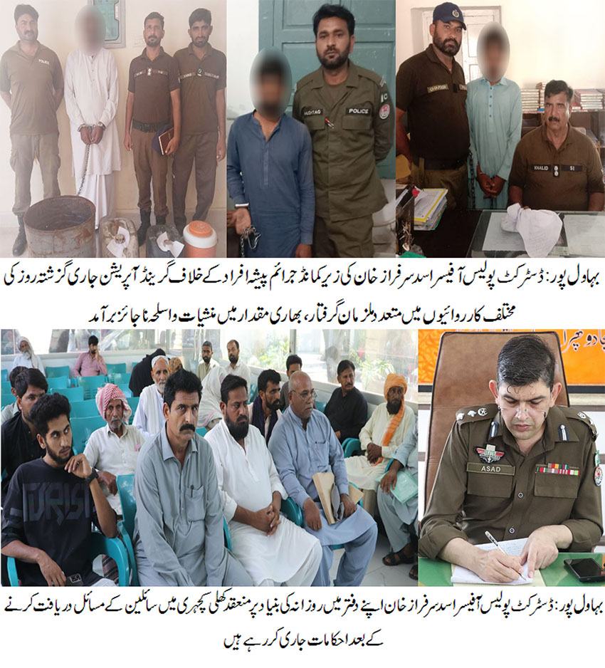 بہاول پور( )ڈسٹرکٹ پولیس آفیسربہاولپور اسد سرفراز خان کی زیر کمانڈ جرائم پیشہ افراد کے خلاف گرینڈ آپریشن جاری، گزشتہ روز کی مختلف کارروائیوں میں 07ملزمان گرفتار۔ بھاری مقدار میں منشیات و اسلحہ ناجائز برآمد۔ جرائم پیشہ افراد کے خلاف جاری کارروائیوں کو مزید تیز کیا جارہا ہے ، ڈی پی اوبہاولپور اسد سرفراز خان