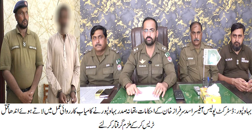 تفصیلات کے مطابق ڈسٹرکٹ پولیس آفیسراسد سرفرازخان نے ایس ڈی پی او سرکل صدر بہاولپور بابر علی اور ایس ایچ او تھانہ صدربہاولپور رائو شہزاد بابرکو آلہ آباد کالونی کی رہائشی شازیہ بانوکے اغوا کے متعلق درج مقدمہ کو ٹریس کرنے کے احکامات جاری کئے اور ملوث ملزمان کو ٹریس کرکے گرفتار کرنے کا ٹاسک دیا اور اسپیشل ٹیم تشکیل دی۔ جس پر ایس ایچ او تھانہ صدر بہاولپورنے اپنی ٹیم کے ہمراہ اورایس ڈی پی او سرکل صدر کی قیادت میں بہت کم وقت میںاغوا اور اندھے قتل کو ٹریس کرکے ملزمان کو گرفتار کرلیا ۔ گرفتار ملزم کی شناخت اللہ ودھایا کے نام سے ہوئی جس نے مقتولہ کو ملنے کے لئے بلوایا اور نامعلوم وجوہات کی بناء پر سر میں اینٹ مار کر قتل کیا ۔اس بابت مزید تحقیقات و تفتیش جاری ہے۔ اس موقع پر ڈی پی او نے بات کرتے ہوئے کہا کہ ملزم چاہے کتنا ہی شاطر کیوں نہ ہو قانون کی گرفت سے نہیں بچ سکتا، کیوں کہ جرم نشان چھوڑ جاتا ہے اور پولیس انویسٹی گیشن کی کامیابی ان نشانوں کی کڑیاں ملاتے ہوئے مجرم تک پہنچنا ہوتا ہے، جس کے لئے پولیس فرانزک ایکسپرٹس، موبائل فون ٹریسنگ سمیت دیگر چیزوں کا سہارا لیتے ہوئے جدید اور روایتی طریقہ تفتیش کے بہترین امتزاج سے ایسے مقدمات کو ٹریس کرنے میں کامیاب ہوتی ہے۔ انہوں نے مزید کہا ایسا گھنائونے فعل کرنے والوں کو تختہ دار تک پہنچایا جاے گا۔ اس کامیابی پر ڈی پی اونے ایس ایچ او تھانہ صدربہاولپور اور ان کی ٹیم کو شاباش دی۔