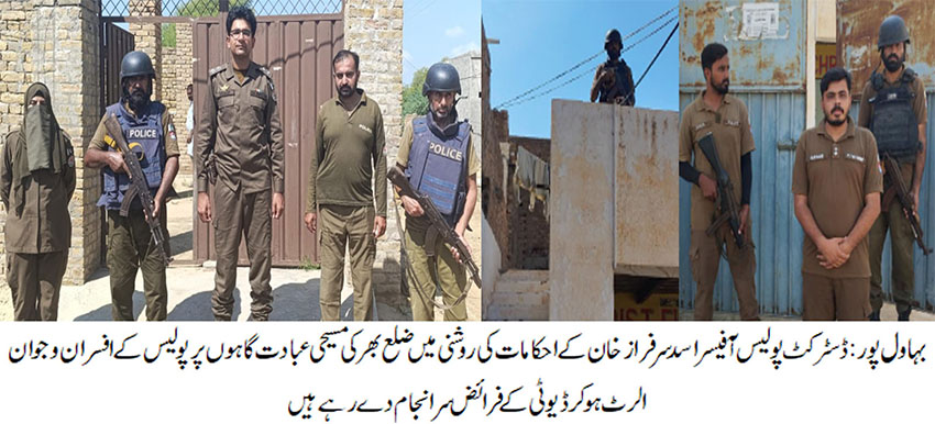 بہاو ل پور( )ڈسٹرکٹ پولیس آفیسر اسد سرفراز خان کے احکامات کی روشنی میں مسیحی عبادت گاہوں کی سیکیورٹی کے سخت انتظامات، سینکڑوں پولیس افسران و اہلکار ڈیوٹی پر تعینات، مسیحی برادری سمیت تمام شہریوں کی حفاظت ہمارے اولین فرائض میں شامل ہے، ڈی پی او اسد سرفراز خان