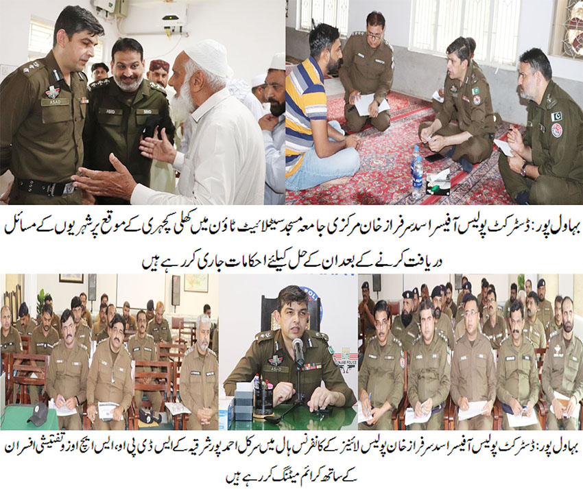 بہاول پور( )ڈسٹرکٹ پولیس آفیسر اسد سرفراز خان کی جانب سے مرکزی جامعہ مسجد سیٹلائیٹ ٹائون علاقہ تھانہ بغدادالجدیدمیں کھلی کچہری کا انعقاد کیا گیا۔ کھلی کچہری میں شہریوں کی بڑی تعداد کو سنا اور انفرادی طور پر متعلقہ افسران شہریوں کے مسائل بر وقت حل کرنے کے احکامات جاری کیے، کھلی کچہری کا مقصد بلاتاخیر شہریوں کے مسائل کو میرٹ پر حل کرنا اور گھر کی دہلیز پر انصاف فراہم کرنا ہے ،ڈی پی او اسد سرفراز خان