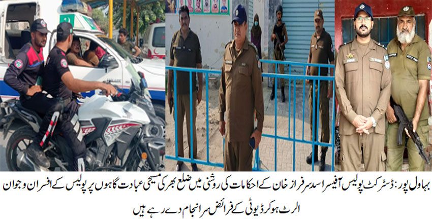 بہاو ل پور( )ڈسٹرکٹ پولیس آفیسر اسد سرفراز خان کے احکامات کی روشنی میں مسیحی عبادت گاہوں کی سیکیورٹی کے سخت انتظامات، سینکڑوں پولیس افسران و اہلکار ڈیوٹی پر تعینات، مسیحی برادری سمیت تمام شہریوں کی حفاظت ہمارے اولین فرائض میں شامل ہے، ڈی پی او اسد سرفراز خان
