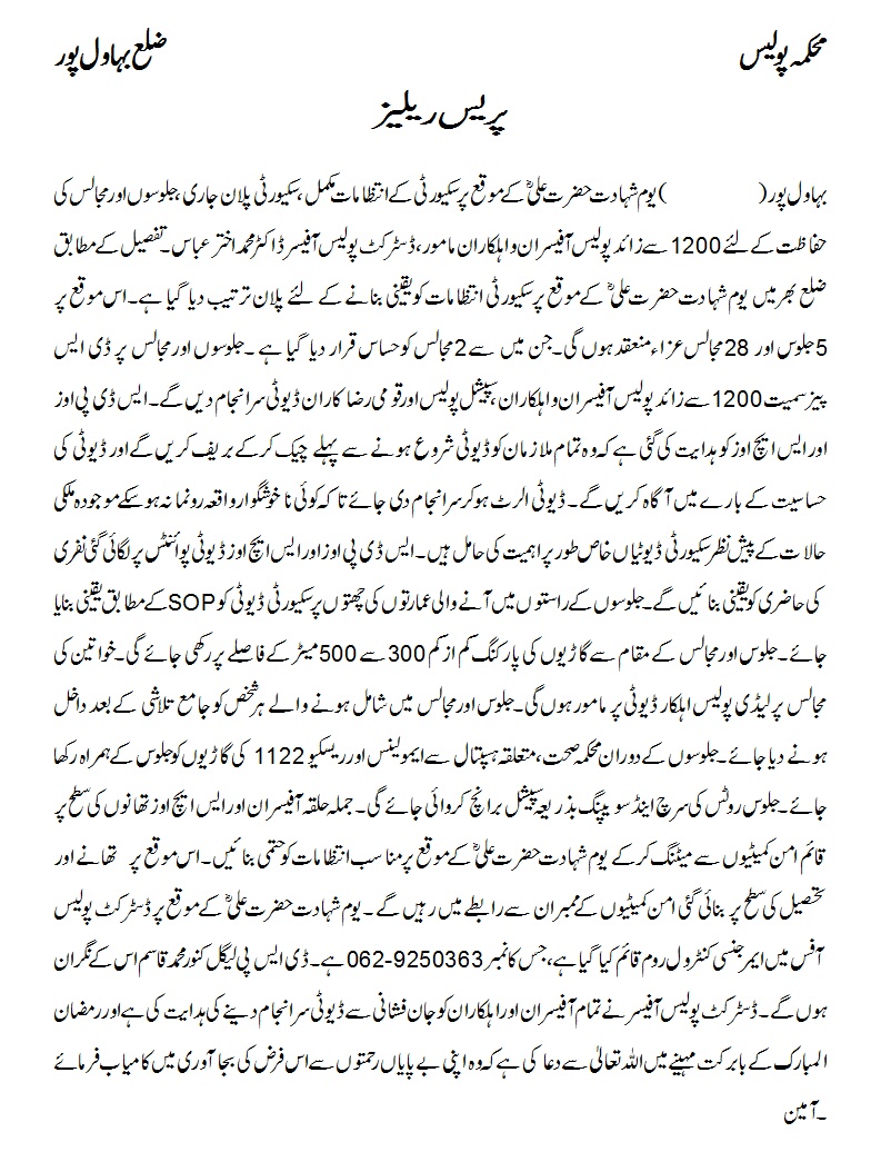 یومِ شہادت حضرت علیؓ کے موقع پر سکیورٹی انتظامات مکمل ، سکیورٹی پلان جاری ، جلوسوں اور مجالس کی حفاظت کے لیے 1200 سے زائد پولیس آفیسران اور اہلکاران مامور ۔ ڈاکٹر محمداختر عباس