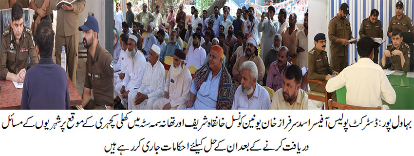 بہاول پور( )ڈسٹرکٹ پولیس آفیسر اسد سرفراز خان کی جانب سے یونین کونسل خانقاہ شریف اور تھانہ سمہ سٹہ میں کھلی کچہری کا انعقاد کیا گیا۔ کھلی کچہری میں شہریوں کی بڑی تعداد کو سنا اور انفرادی طور پر متعلقہ افسران شہریوں کے مسائل بر وقت حل کرنے کے احکامات جاری کیے، کھلی کچہری کا مقصد بلاتاخیر شہریوں کے مسائل کو میرٹ پر حل کرنا اور گھر کی دہلیز پر انصاف فراہم کرنا ہے ،ڈی پی او اسد سرفراز خان