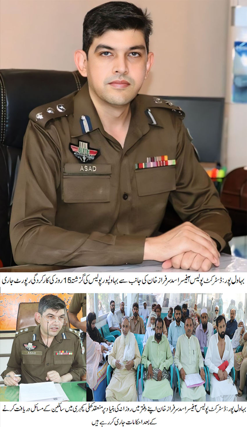 بہاولپور( )ڈسٹرکٹ پولیس آفیسر اسد سرفراز خان کا شہریوں کے مسائل ترجیحی بنیادوں پر حل کرنے کیلئے روزانہ کی بنیاد پر اپنے دفتر میں کھلی کچہری کا انعقاد، 35سے زائد شہریوں نے اپنے مسائل ڈی پی او کے سامنے رکھے۔ پراپرٹی کے مقدمات میں جلد ریکوری کرکے رپورٹ پیش کریں، تاخیر کسی صورت برداشت نہیں کی جائے گی، شہریوں کے مسائل حل کرنے کیلئے ہر ممکن وسائل کو بروئے کار لایا جا رہا ہے ،ڈی پی او اسد سرفراز خان