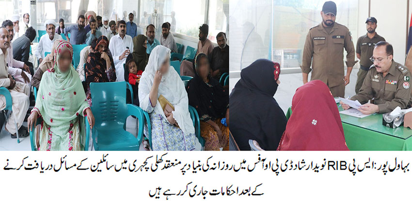 بہاولپور(       )ایس پی آر آئی بی  نوید ارشاد کا شہریوں کے مسائل ترجیحی بنیادوں پر حل کرنے کیلئے روزانہ کی بنیاد پر اپنے دفتر میں کھلی کچہری کا انعقاد، 32سے زائد شہریوں نے اپنے مسائل ایس پی کے سامنے رکھے۔ پراپرٹی کے مقدمات میں جلد ریکوری کرکے رپورٹ پیش کریں، تاخیر کسی صورت برداشت نہیں کی جائے گی، شہریوں کے مسائل حل کرنے کیلئے ہر ممکن وسائل کو بروئے کار لایا جا رہا ہے ،ایس پی آر آئی بی نوید ارشاد