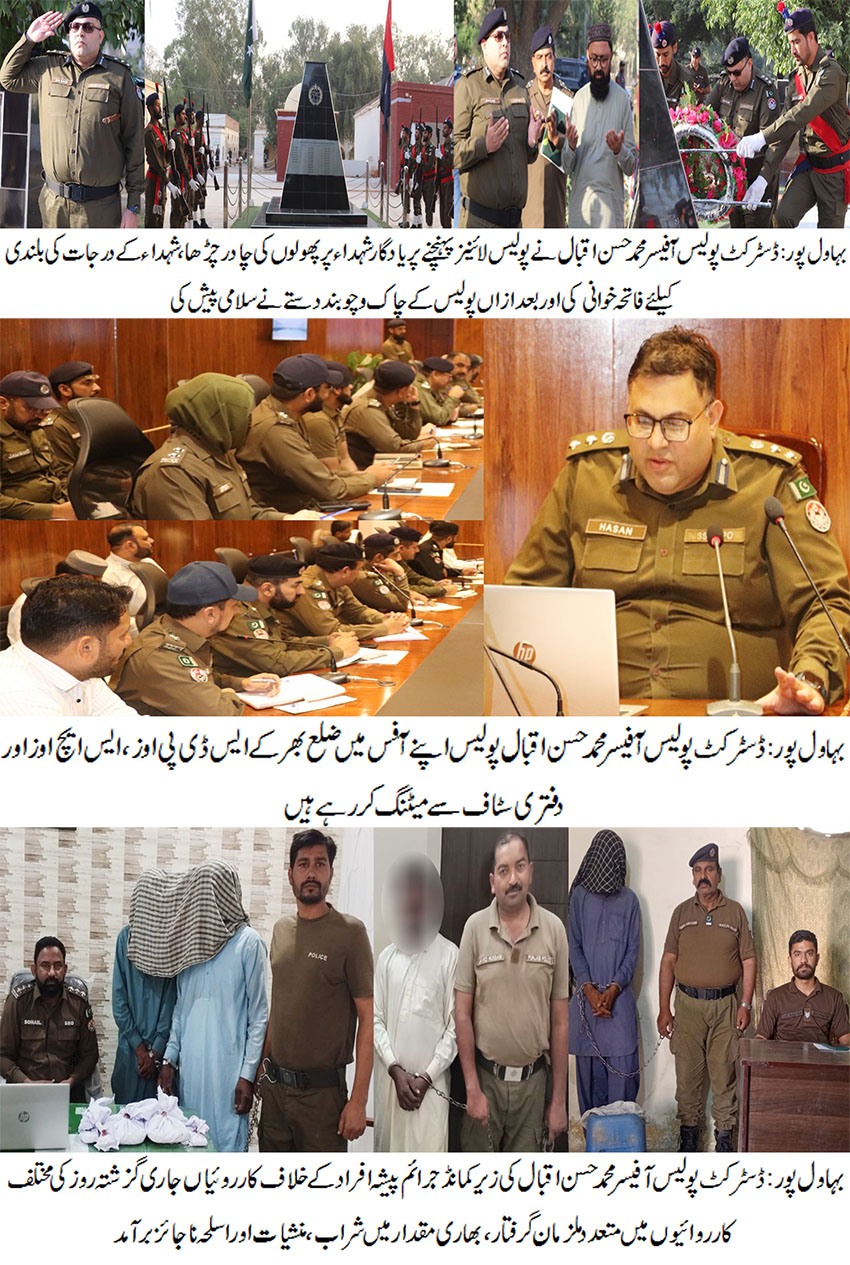 بہاول پور( )ڈسٹرکٹ پولیس آفیسرمحمد حسن اقبال کی زیر کمانڈ جرائم پیشہ افراد کے خلاف کارروائیاں جاری، گزشتہ روز کی مختلف کارروائیوں میں05ملزمان گرفتار۔ بھاری مقدار میں شراب، منشیات و اسلحہ ناجائز برآمد۔ جرائم پیشہ افراد کے خلاف جاری کارروائیوں کو مزید تیز کیا جارہا ہے ، ڈی پی اومحمد حسن اقبال