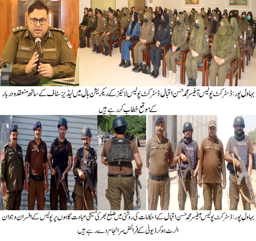 بہاو ل پور( )ڈسٹرکٹ پولیس آفیسر محمد حسن اقبال کے احکامات کی روشنی میں مسیحی عبادت گاہوں کی سکیورٹی کے سخت انتظامات، سینکڑوں پولیس افسران و اہلکار ڈیوٹی پر تعینات، مسیحی برادری سمیت تمام شہریوں کی حفاظت ہمارے اولین فرائض میں شامل ہے، ڈی پی او محمد حسن اقبال
