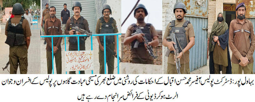 تفصیلات کے مطابق انسپکٹر جنرل آف پولیس پنجاب کی فول پروف سکیورٹی کی ایس او پی کے تحت ڈی پی او محمد حسن اقبال کے احکامات کی روشنی  میں اتوار کے روز مسیحی عبادت گاہوں پر سکیورٹی کے فول پروف انتظامات کئے گئے۔جن پر سینکڑوں کی تعداد میں پولیس افسران و اہلکار تعینات کیے گئے۔ ضلع کے سرکل افسران اور ایس ایچ اوز نے جاری شدہ سکیورٹی پلان کے مطابق ڈیوٹی پر مامور افسران و اہلکاروں کو چیک کرنے کے ساتھ ساتھ ڈیوٹی کی حساسیت کے بارے میں بریف کیا اور ڈیوٹی الرٹ رہ کر سرانجام دینے کی ہدایت کی،بعد ازاں سکیورٹی سکینینگ کے آلات کی انسٹالیشن اور ورکنگ کے ساتھ ساتھ جامعہ تلاشی کے عمل کا بھی جائزہ لیا۔ سول پارچات میں سکیورٹی اہلکاروں کے ساتھ معاونین اداروں نے بھی اردگرد کے ماحول اور غیر متعلقہ افراد کی سرگرمیوں پر نظر رکھی۔ ضلع بھر میں قیام امن کو یقینی بنانے کے لئے مختلف مقامات کے علاوہ ضلع کے خارجی اور داخلی راستوں پر جرائم پیشہ افراد کی نقل و حرکت کیلئے موثر سنیپ چیکنگ کا عمل بھی جاری ہے۔ ڈی پی او محمد حسن اقبال نے مزید ہدایات جاری کرتے ہوئے کہا کہ ایس ایچ اوز اور پٹرولنگ ڈیوٹی پر مامور افسران اقلیتی عبادت گاہوں کے ارد گرد گشت کو ہر صورت یقینی بنائیں، کسی بھی مشتبہ اشخاص سے پوچھ گچھ اور اقلیتی عبادت گاہوں کے اردگرد رہنے والے غیر متعلقہ افراد پر بھی نظر رکھیں، معاشرتی امن کے لیے بہاولپور میں رہنے والے تما م اقلیتی برادری کی سکیورٹی کو فول پروف رکھا جائے، غفلت و لاپرواہی برداشت نہیں کی جائے گی۔ اس موقع پر ڈی پی او محمد حسن اقبال نے ہدایات جاری کرتے ہوئے کہا کہ ضلع میں امن و امان کے حوالے سے دیگر سکیورٹی فرائض کے ساتھ عبادت گاہوں میں بھی سکیورٹی ایس او پیز پر عملدرآمد کو یقینی بنائیں، ایسے مقامات کی سکیورٹی جہاں پر عوام الناس بھاری تعداد میں جمع ہو ایسی جگہوں پر امن و امان کی صورتحال کو برقرار رکھنا نہایت ضروری ہے، مسیحی برادری سمیت تمام شہریوں کی حفاظت ہمارے اولین فرائض میں شامل ہے۔