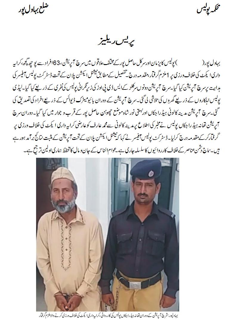پولیس کا یزمان اور حاصل پور سرکل میں مختلف علاقوں کا سرچ آپریشن ، 63 افراد سے پُوچھ گچھ اور کرایہ داری ایکٹ کی خلاف ورزی پر 1 ملزمان گرفتار مقدمات درج