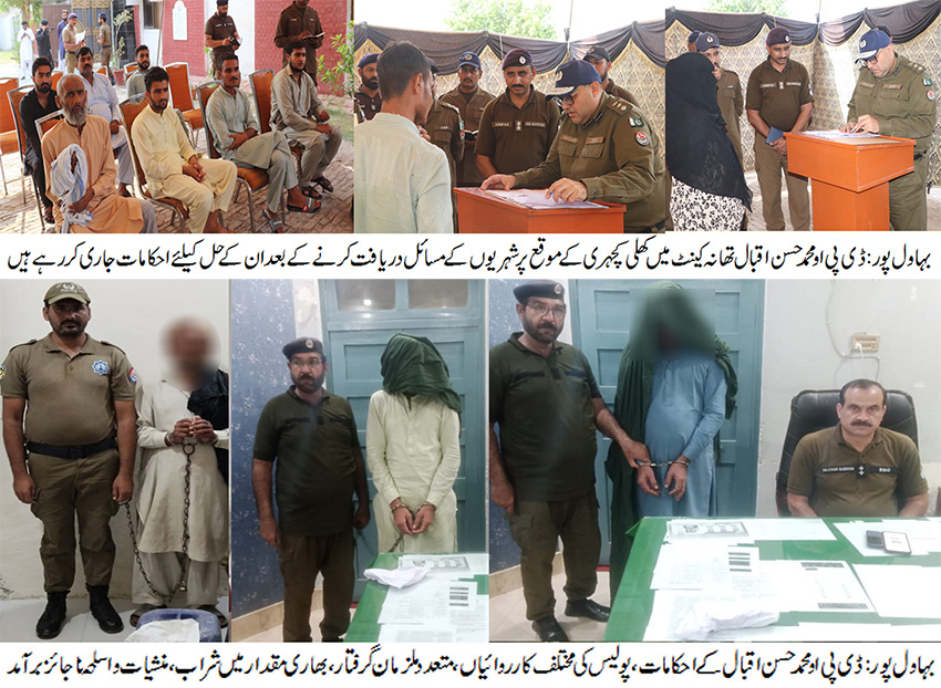 بہاول پور( )ڈسٹرکٹ پولیس آفیسر محمد حسن اقبال کی جانب سے تھانہ کینٹ میں کھلی کچہری کا انعقاد کیا گیا۔ کھلی کچہری میںاہل علاقہ کی بڑی تعداد کو سنا اور انفرادی طور پر متعلقہ افسران کو شہریوں کے مسائل بر وقت حل کرنے کے احکامات جاری کیے، کھلی کچہری کا مقصد بلاتاخیر شہریوں کے مسائل کو میرٹ پر حل کرنا اور گھر کی دہلیز پر انصاف کی فراہمی کو یقینی بنانا ہے،ڈی پی او محمد حسن اقبال