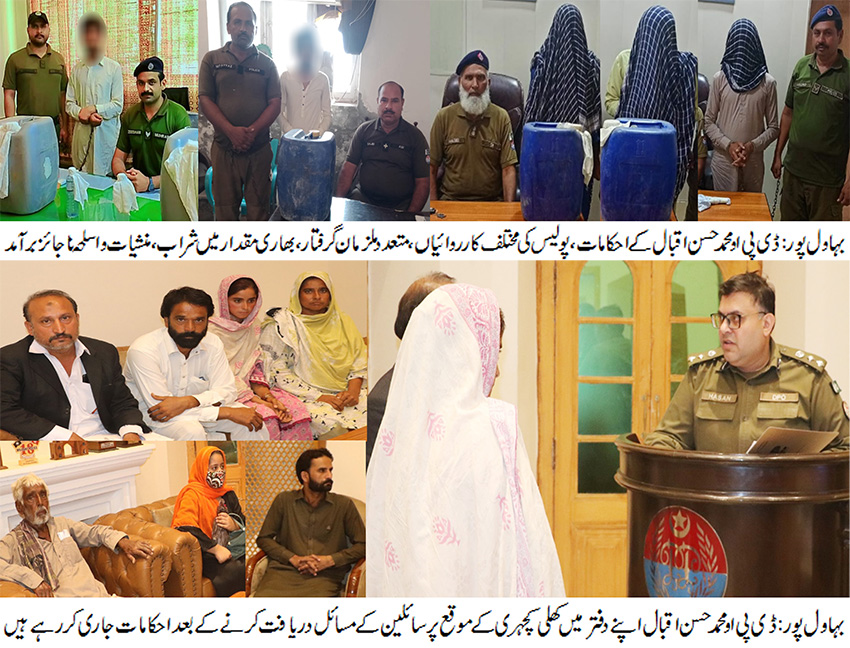بہاول پور(      )ڈسٹرکٹ پولیس آفیسرمحمد حسن اقبال کی کمانڈ میں بہاولپور پولیس کا سماج دشمن عناصر کے خلاف گرینڈ آپریشن، مختلف کارروائیوں میں14ملزمان گرفتار۔بھاری مقدار میں شراب،منشیات اور اسلحہ ناجائز برآمد۔جرائم پیشہ افراد کے خلاف جاری کارروائیوں کو مزید تیز کیا جارہا ہے ، ڈی پی اومحمد حسن اقبال