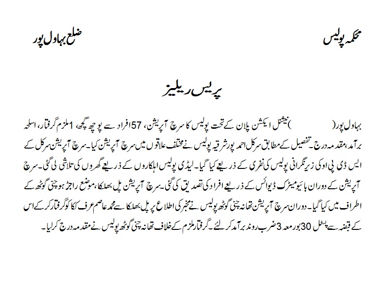نیشنل ایکشن پلان کے تحت بہاولپور پولیس کا سرچ آپریشن ، 57 افراد سے پوچھ گچھ ، ایک ملزم گرفتار اسلح برآمد ، مقدمہ درج
