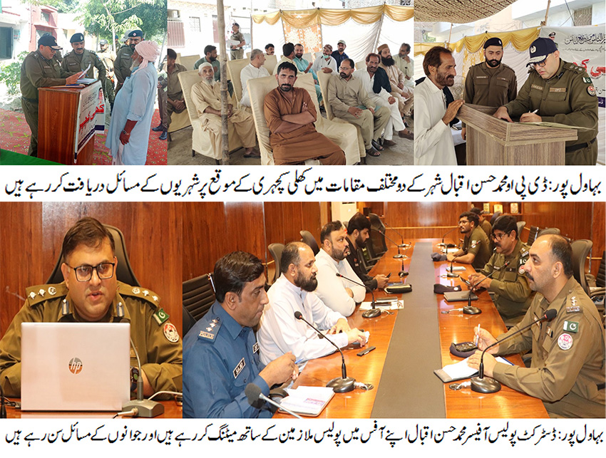 بہاول پور( )ڈسٹرکٹ پولیس آفیسر محمد حسن اقبال کا دو مقامات پر کھلی کچہری کا انعقاد۔ کھلی کچہری میںاہل علاقہ کی بڑی تعداد کو سنا اور افسران کو شہریوں کے مسائل بر وقت حل کرنے کے احکامات جاری کیے، کھلی کچہری کا مقصد بلاتاخیر شہریوں کے مسائل کو میرٹ پر حل کرنا اور گھر کی دہلیز پر انصاف کی فراہمی کو یقینی بنانا ہے،ڈی پی او محمد حسن اقبال