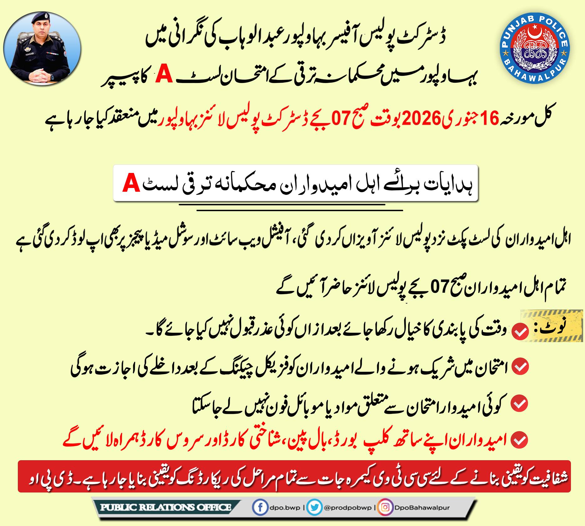 پر موشن امتحان لسٹ "اے " میں شامل امیدواران کی لسٹ شائع کی جارہی ہے اسے امید وارن جن کو اس لسٹ میں درج کو الف سے متعلق کوئی اعترص ہو یا جن کا نام اس لسٹ میں شامل نہ ہے ۔ اور وہ بطابق اہلیت پر موشن لسٹ "اے" کے امتحان کے اہل ہیں اور ان کا نام اس لسٹ میں نہ ہے تو وہ مورخہ 14.01.2026 تک اپنی تحریری درخواست دفتر ہذا نز د ایس آر سی برانچ میں جمع کروائیں بصورت دیگر ان کو لسٹ "اے" کے امتحان میں شامل نہ کیا جائے گا۔