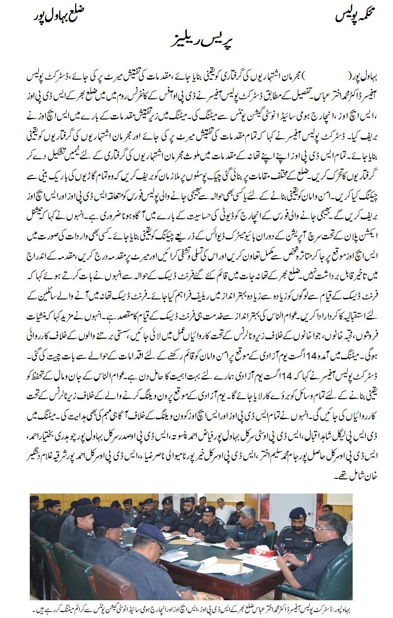 مجرمان اشتہاریوں کی گرفتاری کو یقینی بنایا جاۓ ، مقدمات کی تفتیش میرٹ پر کی جاۓ، ڈسٹرکٹ پولیس آفیسر ڈاکٹر محمد اختر عباس