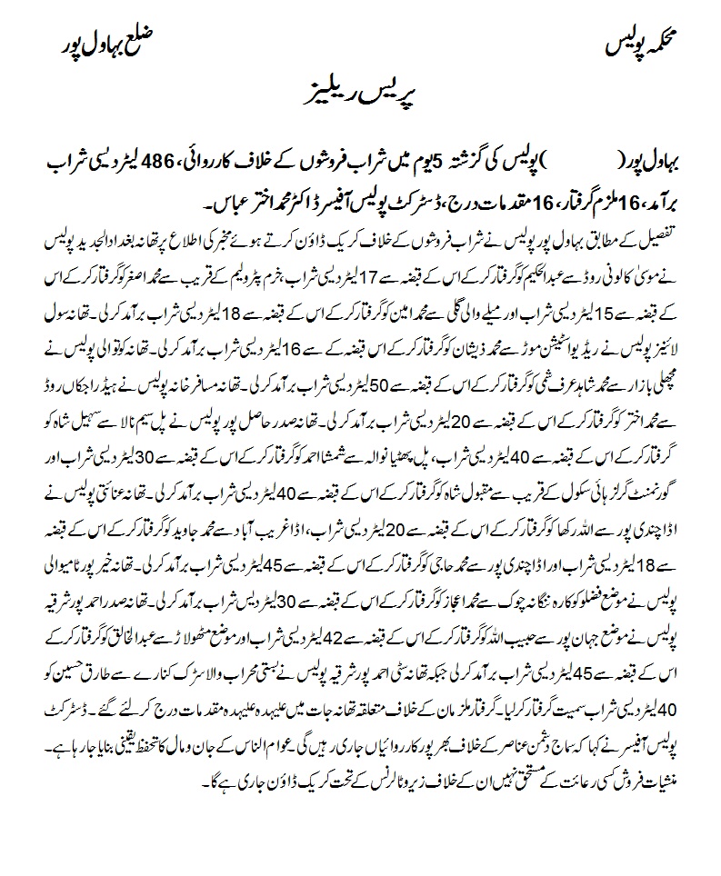 پولیس کا گذشتہ 5 یوم میں شراب فروشوں کے خلاف کاروائی ،486 لیٹر دیسی شراب برآمد 16 ملزمان گرفتار مقدمات درج