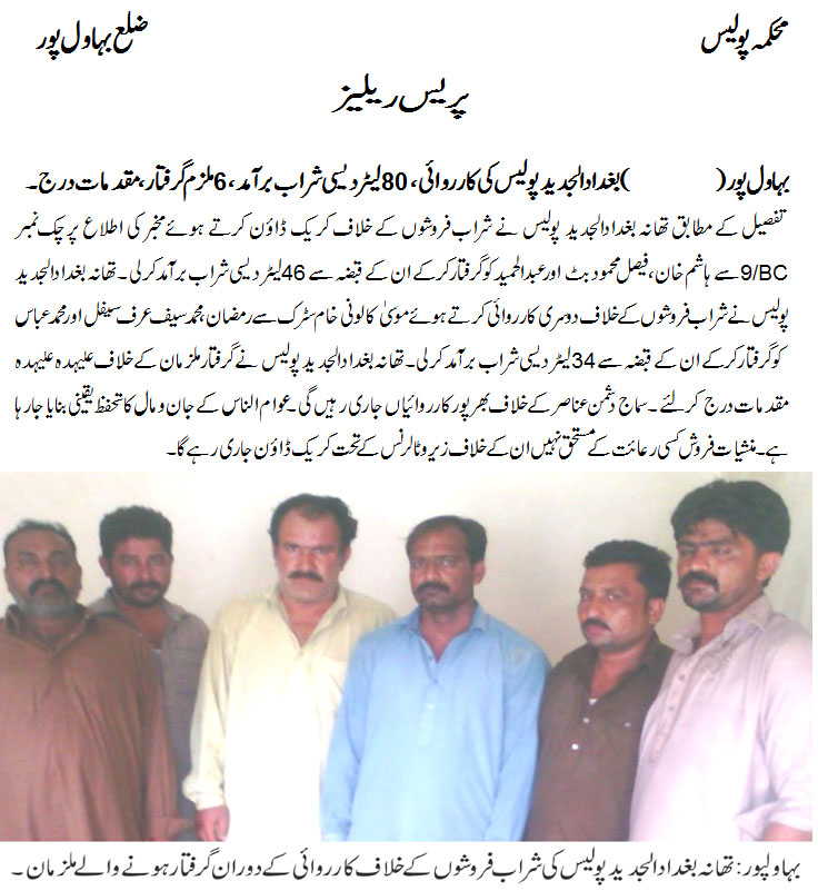 بغداد الجدید پولیس کی کاروائی ، 80 لیٹر دیسی شراب برآمد ، 6 ملزمان گرفتار مقدمہ درج