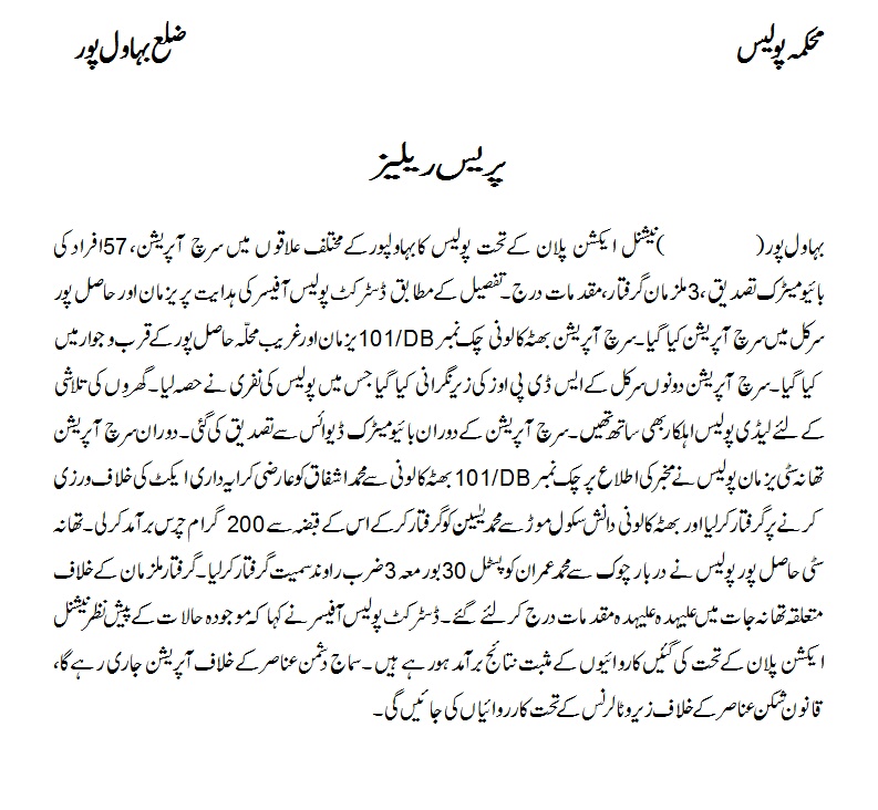 نیشنل ایکشن پلان کے تحت بہاولپور پولیس کا مختلف علاقوں میں سرچ آپریشن ، 57 افراد کا بذریعہ بائومیٹریک ڈیوائس سے تصدیق ،3 ملزمان گرفتار مقدمات درج
