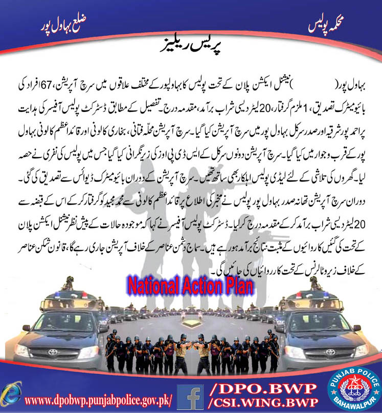 نیشنل ایکشن پلان کے تحت بہاولپور پولیس کا مختلف علاقوں میں سرچ آپریشن ، 67 افراد کا بذریعہ بائومیٹریک ڈیوائس سے تصدیق ، 1ملزم گرفتار، 20 لیٹر دیسی شراب برآمد ، مقدمہ درج
