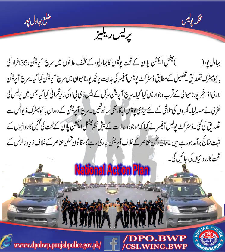 نیشنل ایکشن پلان کے تحت بہاولپور پولیس کا مختلف علاقوں میں سرچ آپریشن ، 35 افراد کا بذریعہ بائومیٹریک ڈیوائس سے تصدیق
