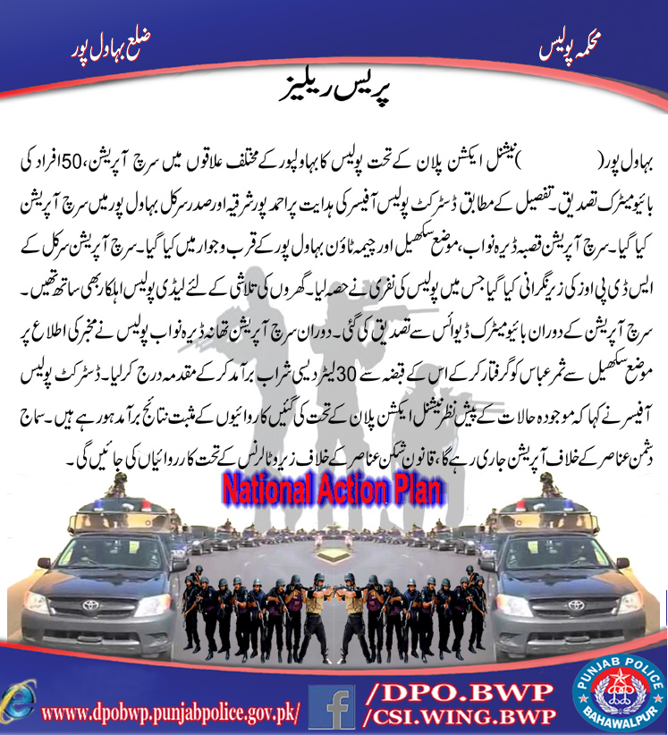نیشنل ایکشن پلان کے تحت بہاولپور پولیس کا مختلف علاقوں میں سرچ آپریشن ، 50 افراد کا بذریعہ بائومیٹریک ڈیوائس سے تصدیق