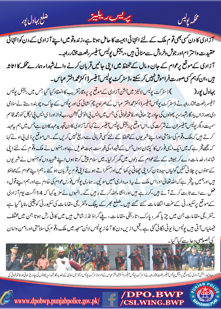 آزاری کا دن کسی بھی قوم کے لیے انتہائی اھمیت کادن ہوتاھے زندہ قومییں اپنے آزاری کے دن کو انتہائی عقیدت واحترام اور جوش وخروش سے مناتی ہیں ، ریجنل پولیس آفیسر بہاولپور رفعت مختار راجہ