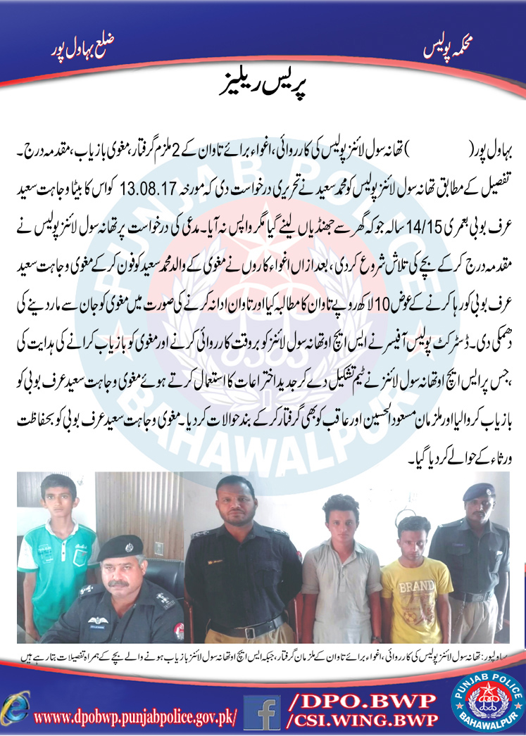 تھانہ سول لائینز پولیس کی کاروائی ،اغواه براۓ تاوان کے 2 ملزم گرفتار، مغوی بازیاب، مقدمہ درج