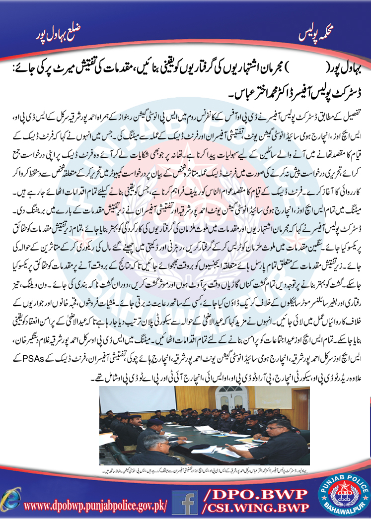 مجرمان اشتہاریوں کی گرفتاری کو یقینی بنایا جاۓ ، مقدمات کی تفتیش میرٹ پر کی جاۓ ، ڈسٹرکٹ پولیس آفیسر ڈاکٹر محمد اختر عباس