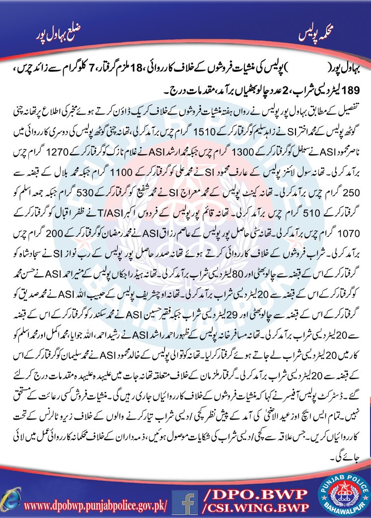 پولیس کا منشیات فروشوں کے خلاف کاروائی ،18 ملزمان گرفتار ، 7 کلوگرام سے زائد چرس ، 189لیٹر دیسی شراب ، 2 چالوں بھٹیاں برآمد ،مقدمات درج