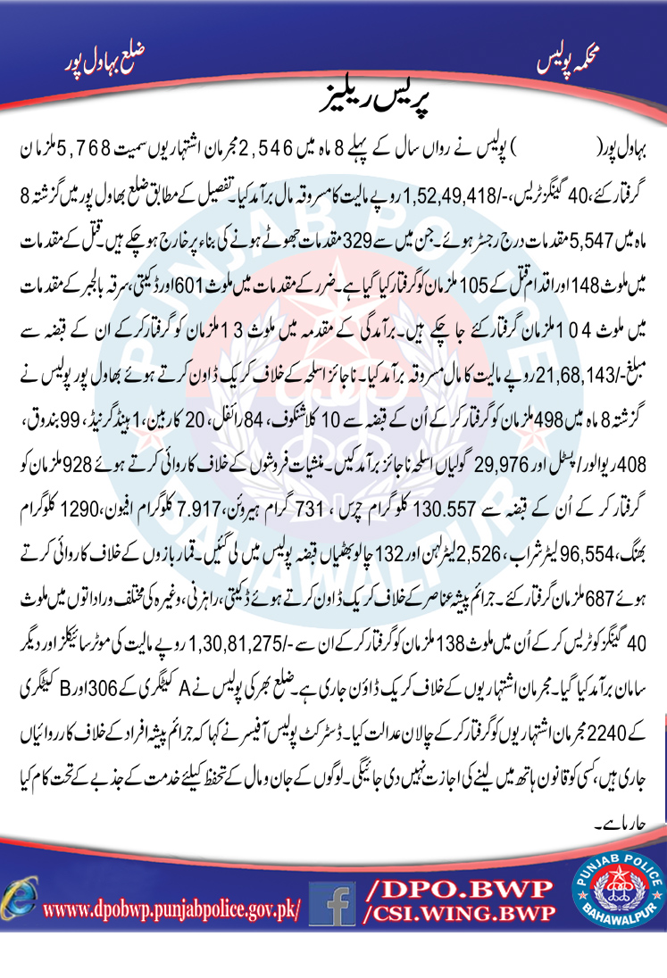 پولیس نے رواں سال کے پہلے 8 ماہ میں 2,546 اشتہاریوں سمیت 5,768 ملزمان گرفتار کیے، 40 کریمنل گینگز ٹریس کر کے لاکھوں روپے مالیت کا مسروقہ سامان برآمد کیا
