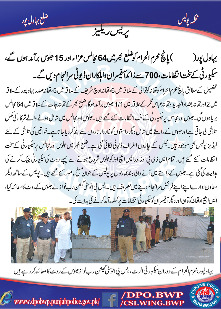 پانچ محرم الحرام ضلع بھر 64 مجالس عزاء 15 جلوس برآمد ہونگے، سکیورٹی کے سخت انتظامات ، 700 سے زائد پولیس آفیسران و اہلکاراآن ڈیوٹی سر انجام دیں گے