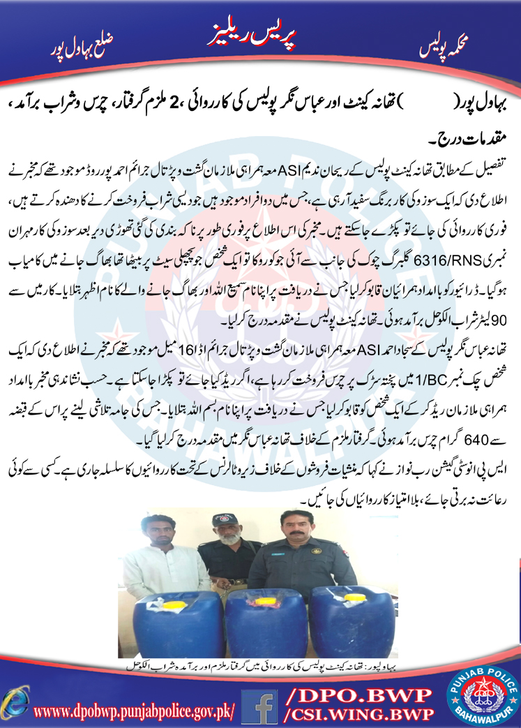تھانہ کینٹ بہاولپور اور تھانہ عباس نگر پولیس کے ساتھ منشیات فروشوں کے خلاف مشترکہ کاروائی 2ملزم گرفتار ، شراب اور چرس برآمد ، مقدمہ درج