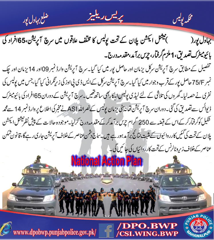 نیشنل ایکشن پلان کے تحت بہاولپور پولیس کا مختلف علاقوں میں سرچ آپریشن ، 65 افراد کا بذریعہ بائومیٹریک ڈیوائس سے تصدیق ،1ملزم گرفتار ،چرس برآمد ،مقدمہ درج