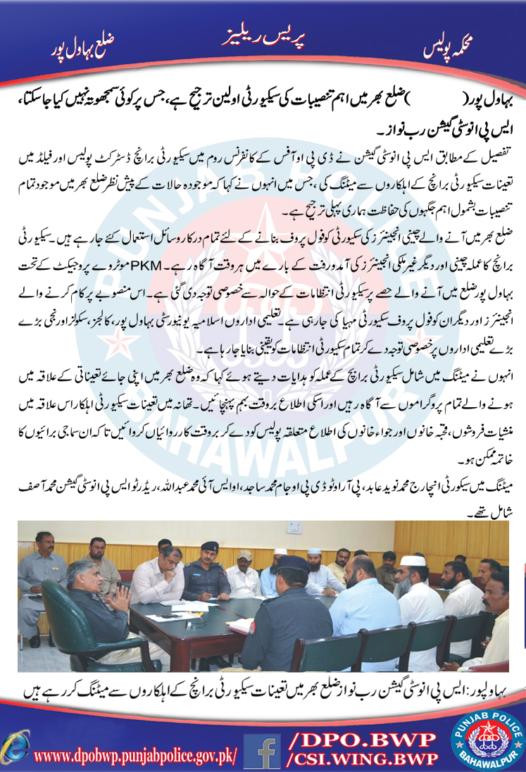 ضلع بھر کی اہم تنصیبات کی سکیورٹی اولین ترجیح ھے،جس پر کوئی سمجھوتہ نہیں کیا جاسکتا ۔ ایس پی اینوسٹی گیشن رب نواز