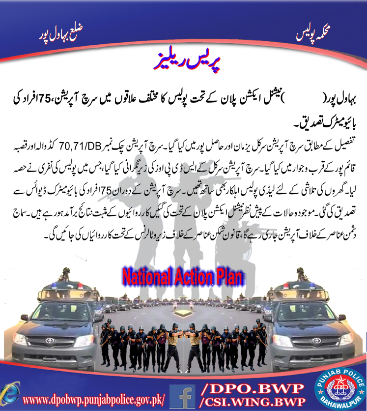 نیشنل ایکشن پلان کے تحت بہاولپور پولیس کا مختلف علاقوں میں سرچ آپریشن ، 75 افراد کا بذریعہ بائومیٹریک ڈیوائس سے تصدیق
