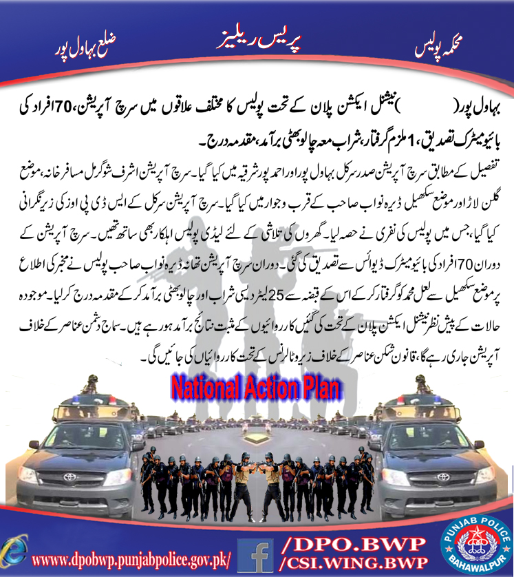 نیشنل ایکشن پلان کے تحت بہاولپور پولیس کا مختلف علاقوں میں سرچ آپریشن ، 70افراد کا بذریعہ بائومیٹریک ڈیوائس سے تصدیق ایک ملزم گرفتار ،شراب معہ چالو بھٹی برآمد ،مقدمہ درج