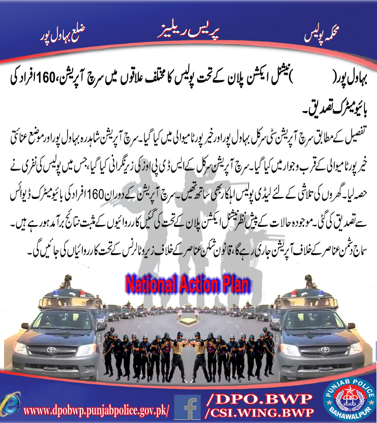 نیشنل ایکشن پلان کے تحت بہاولپور پولیس کا مختلف علاقوں میں سرچ آپریشن ، 160 افراد کا بذریعہ بائومیٹریک ڈیوائس سے تصدیق