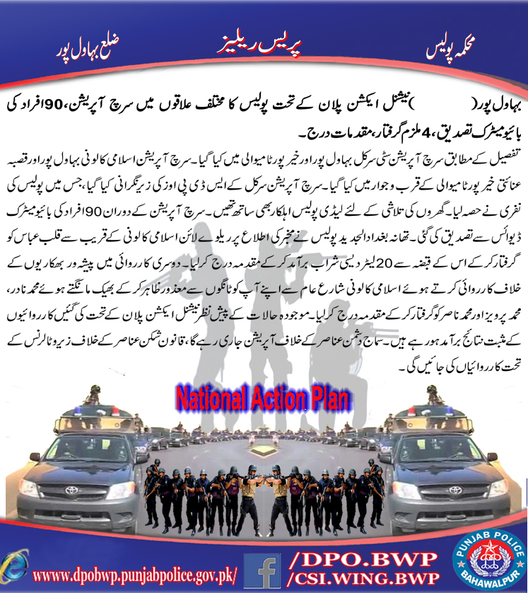 نیشنل ایکشن پلان کے تحت بہاولپور پولیس کا مختلف علاقوں میں سرچ آپریشن ، 90 افراد کا بذریعہ بائومیٹریک ڈیوائس سے تصدیق ، 4 ملازمان گرفتار ، مقدمات درج