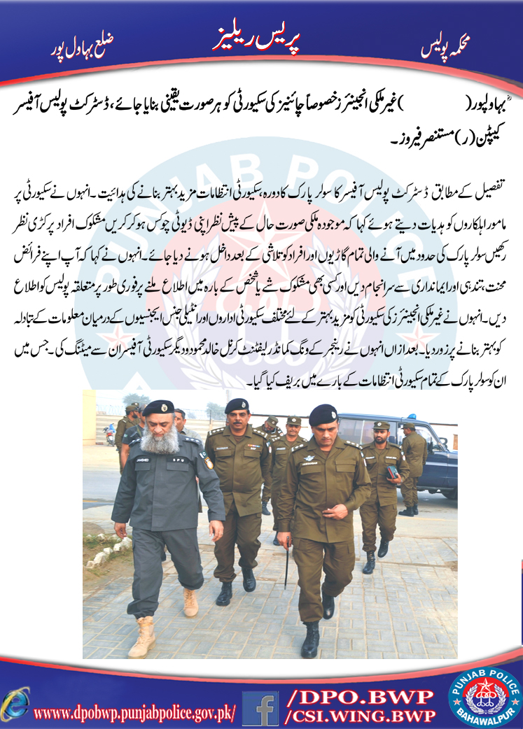 غیر مُلکی اینجینئرز خصوصاً چائنیز کی سکیورٹی کو ہر صورت یقینی بنایاجاۓ ، ڈسٹرکٹ پولیس آفیسر کیپٹن (ریٹائرڈ ) مستنصر فیروز۔