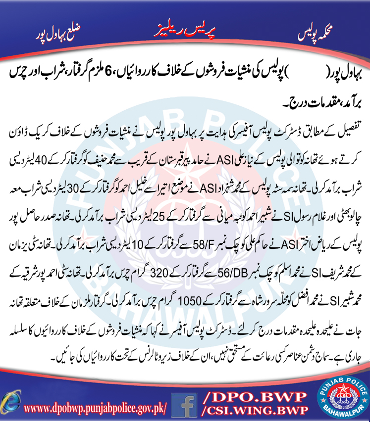 × بہاولپور پولیس کی منشیات فروشوں کے خلاف کاروائیاں،6 ملزم گرفتار ،شراب اور چرس برآمد ،مقدمات درج