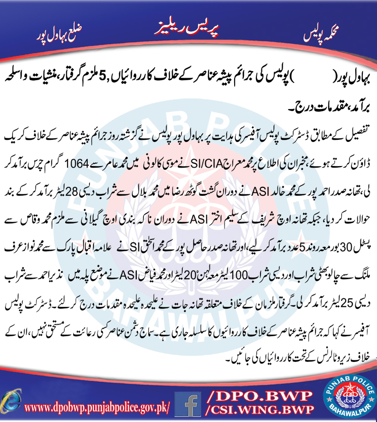 بہاولپور پولیس کی جرائم پیشہ عناصر کے خلاف کاروائیاں، 5 ملزم گرفتار ،منشیات واسلحہ برآمد ،مقدمات درج۔