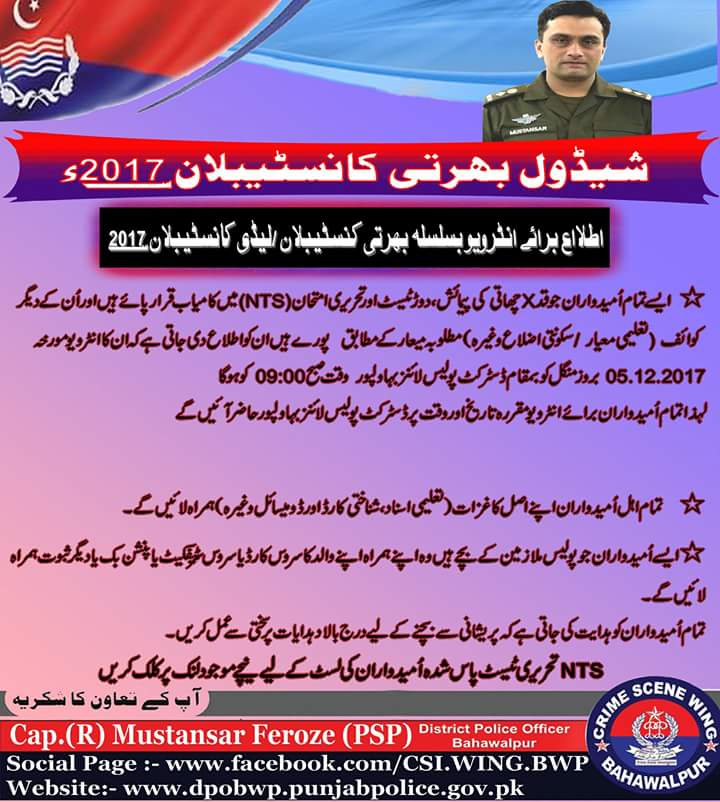 ضلع بہاولپور میں جنرل پولیس کی بھرتی کا انٹرویو مورخہ 05 دسمبر 2017ء بروز منگل کو وقت 09:00 صبح بمقام ڈسٹرکٹ پولیس لائن بہاولپور منعقد کیا جارہا تمام اہل امیدواران سے گذارش ھےکہ بمطابق و شیڈول پولیس لائن بہاولپور حاضر آئیں ۔