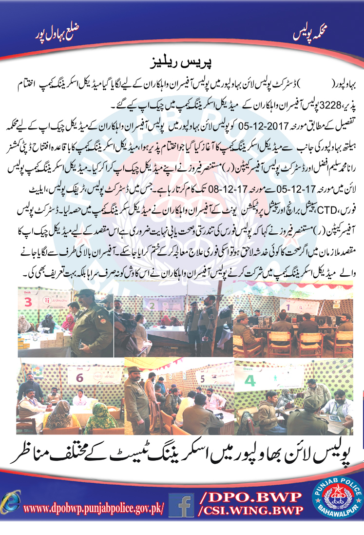 ڈسٹرکٹ پولیس لائینز بہاولپور میں پولیس آفیسران و اہلکاران کے لیے لگایا گیا میڈیکل کیمپ اختتام پذير ، 3228 پولیس آفیسران و اہلکاران کے میڈیکل اسکریننگ کیمپ میں چیک اپ کیے گئے۔ .