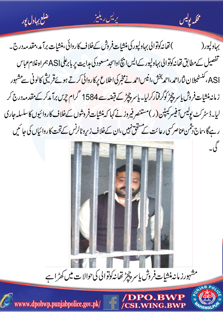 تھانہ کوتوالی بہاولپور کی منشیات فروش کے خلاف کاروائی ،منشیات برآمد، مقدمہ درج۔ .