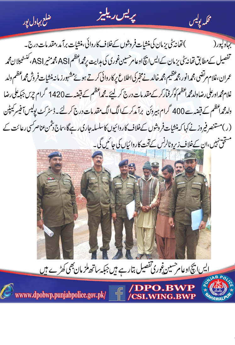 تھانہ سٹی یزمان کی منشیات فروشوں کے خلاف کاروائی ، منشیات برآمد ، مقدمات درج