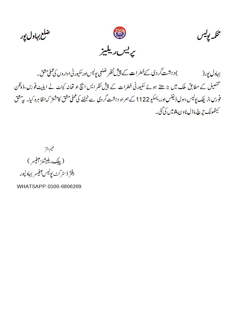 دہشت گردی کے خطرات کے پیش نظر ضلعی پولیس اور سکیورٹی اداروں کی عملی مشق۔