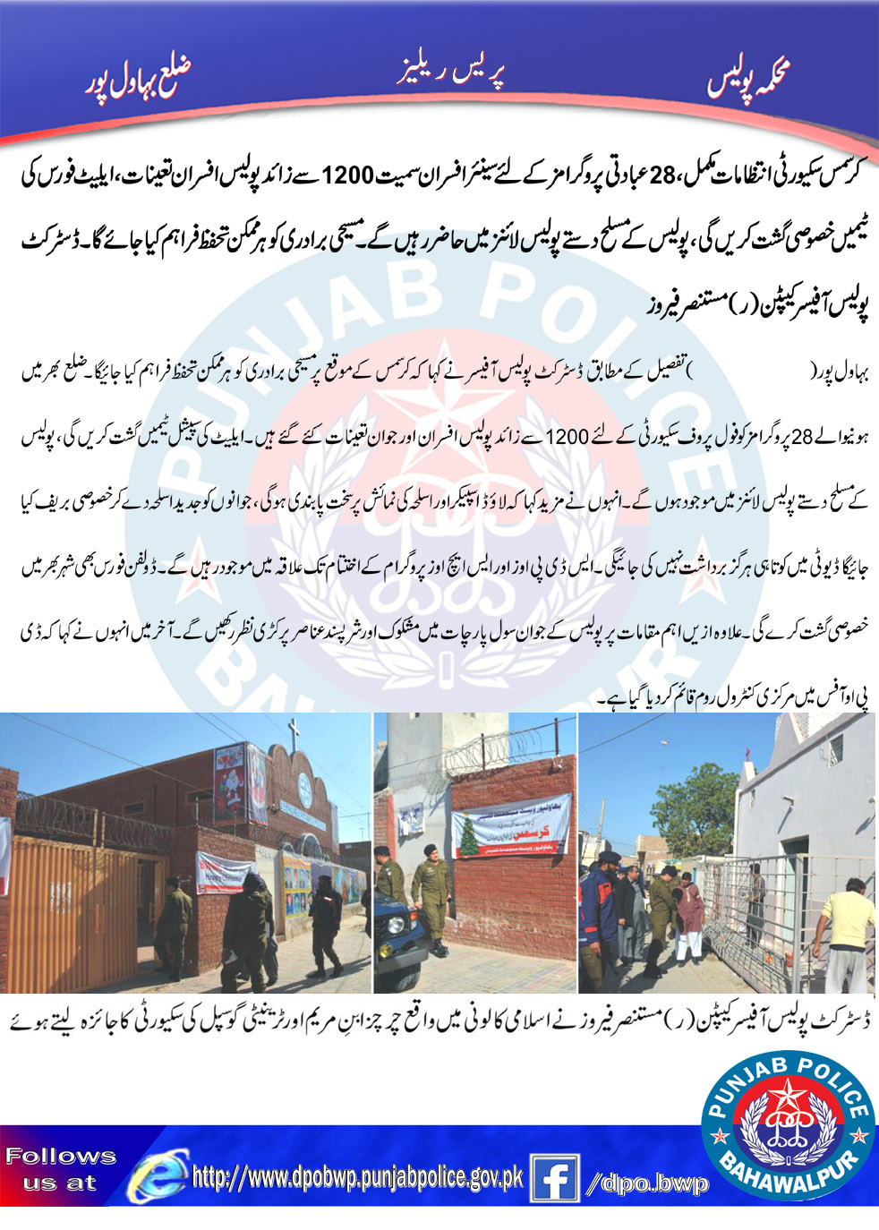 بہاول پور:ڈسٹرکٹ پولیس آفیسر کیپٹن (ر) مستنصر فیروز نے اسلامی کالونی میں واقع چرچز ٹرینیٹی گوسپیل اور ابنِ مریم کی سکیورٹی کا جائزہ لیا۔