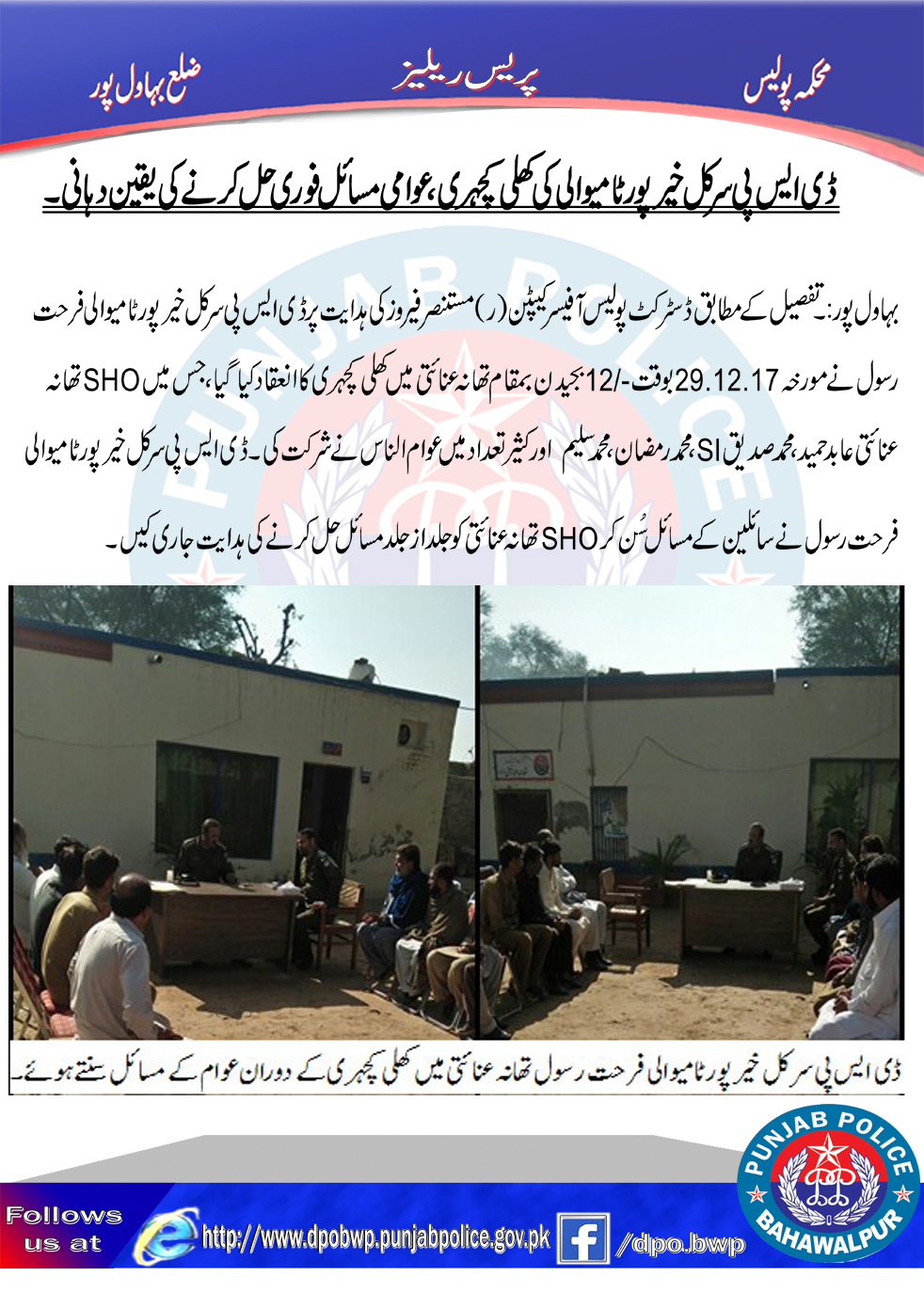ڈی ایس پی سرکل خیرپور ٹامیوالی کی کھلی کچہری ، عوامی مسائل فوری حل کرنے کی یقین دہانی ۔