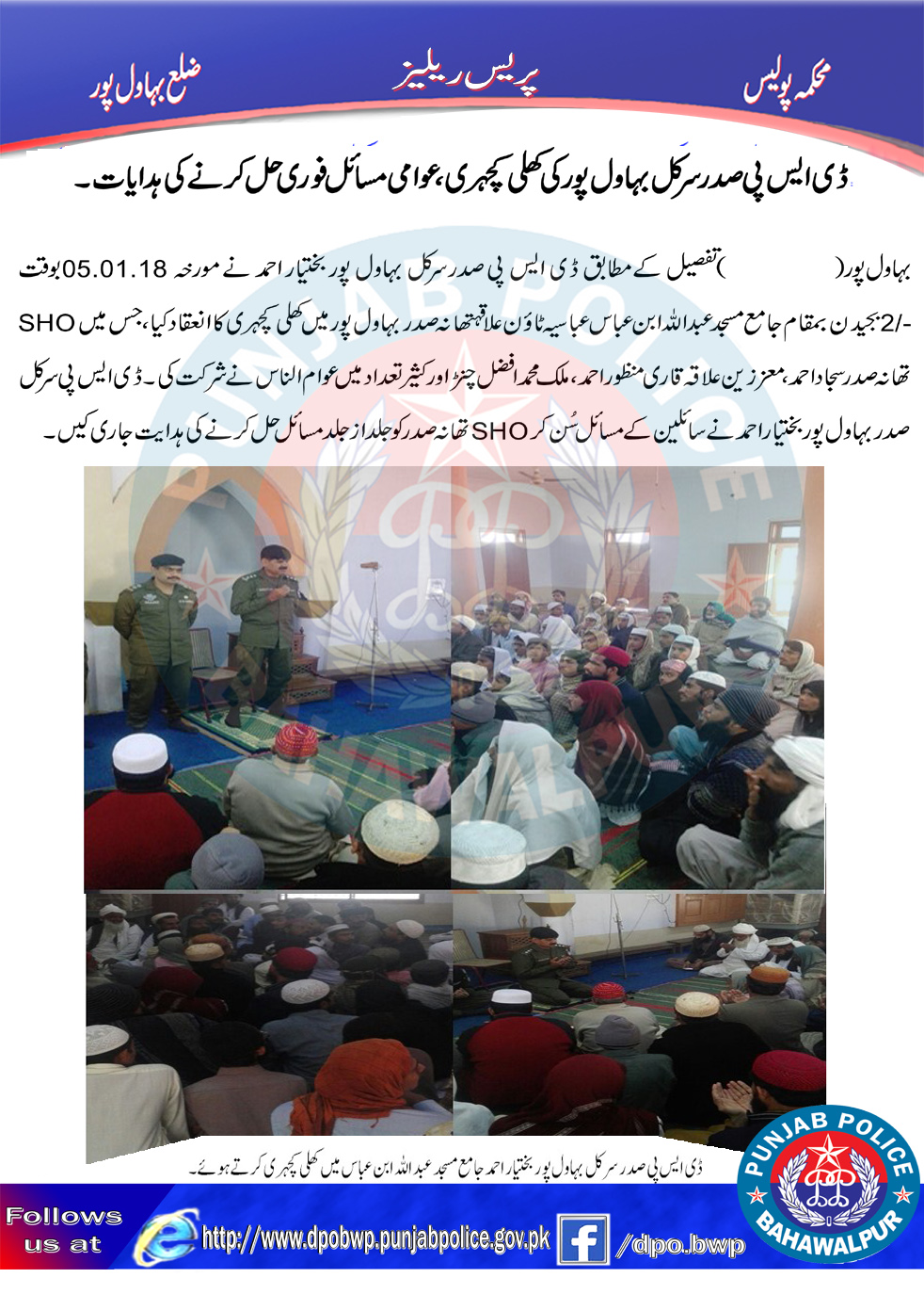ڈی ایس پی صدر سرکل بہاولپور کی کھلی کچہری ، عوامی مسائل فوری حل کرنے کی ہدایت ۔