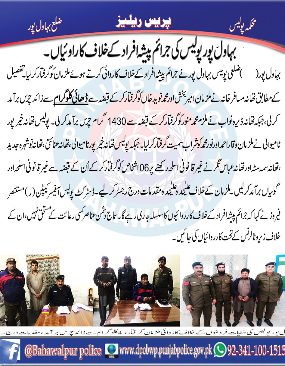 بہاولپور پولیس نے جرائم پیشہ افراد کے کاروائی، ملزمان گرفتار ، مقدمات اندراج ۔